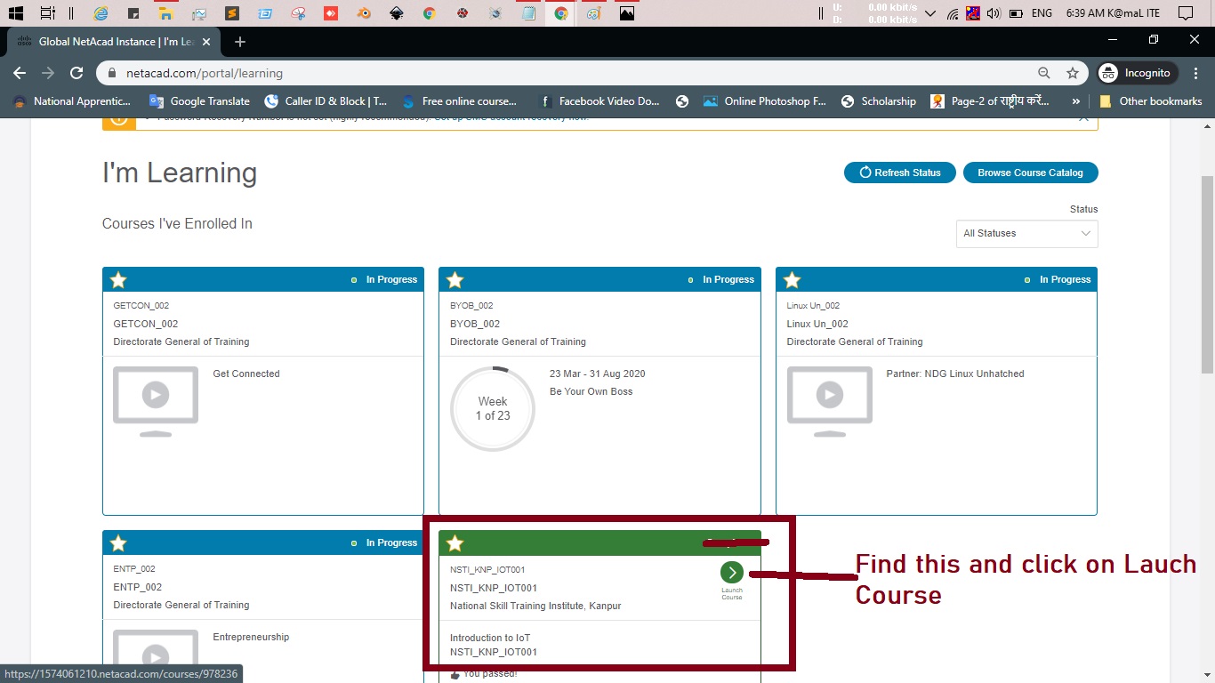 अब आपके सामने नीचे दिए गए चित्र के अनुसार आपका डैशबोर्ड ओपन हो जाएगा जिसमें आपको एनएसटीआई कानपुर लिखा हुआ दिखाई देगा जिसका कोड नंबर IOT 001 होगा।आप नीचे दिए गए चित्र के अनुसार लांच कोर्स पर क्लिक कीजिए।